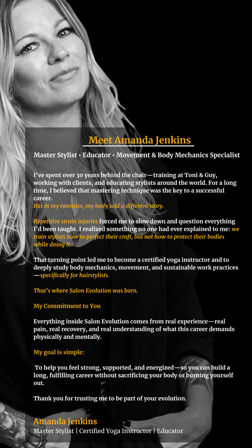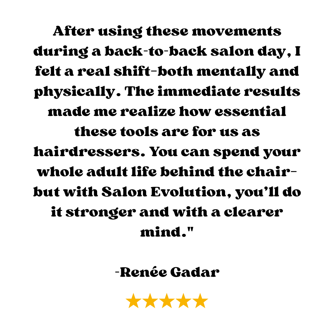 My signature program builds new habits through targeted in-salon practices that strengthen the muscles that matter to improve your technique, reduce injury risk, plus quick breathwork reset to prevent burnout. So that you can gain more energy, see your work with a fresh perspective, and build a career that supports your creativity, your clientele, and your financial freedom for years to come.